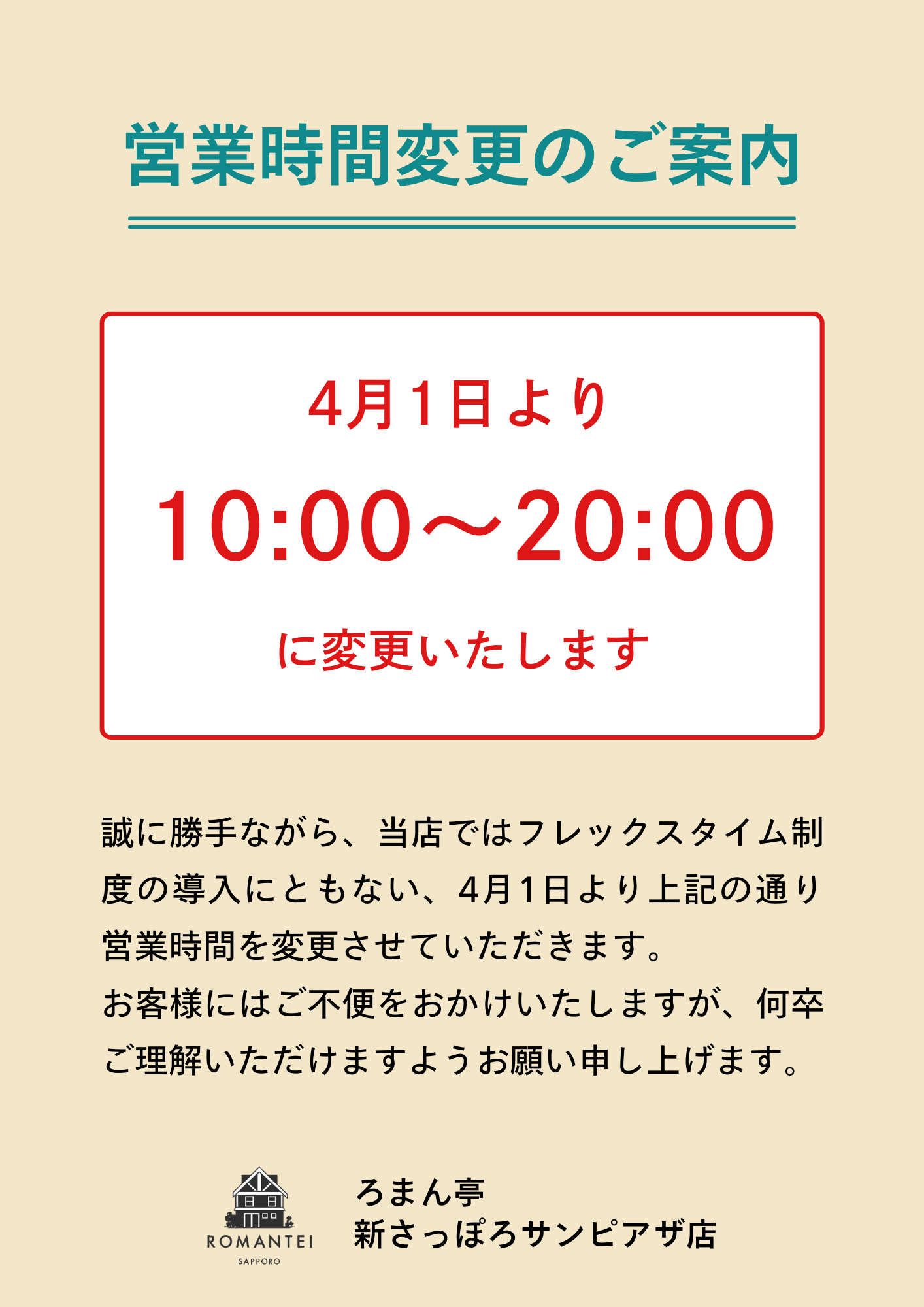 新さっぽろサンピアザ店につきまして、4月1日からの営業時間が以下の通り変更となります。